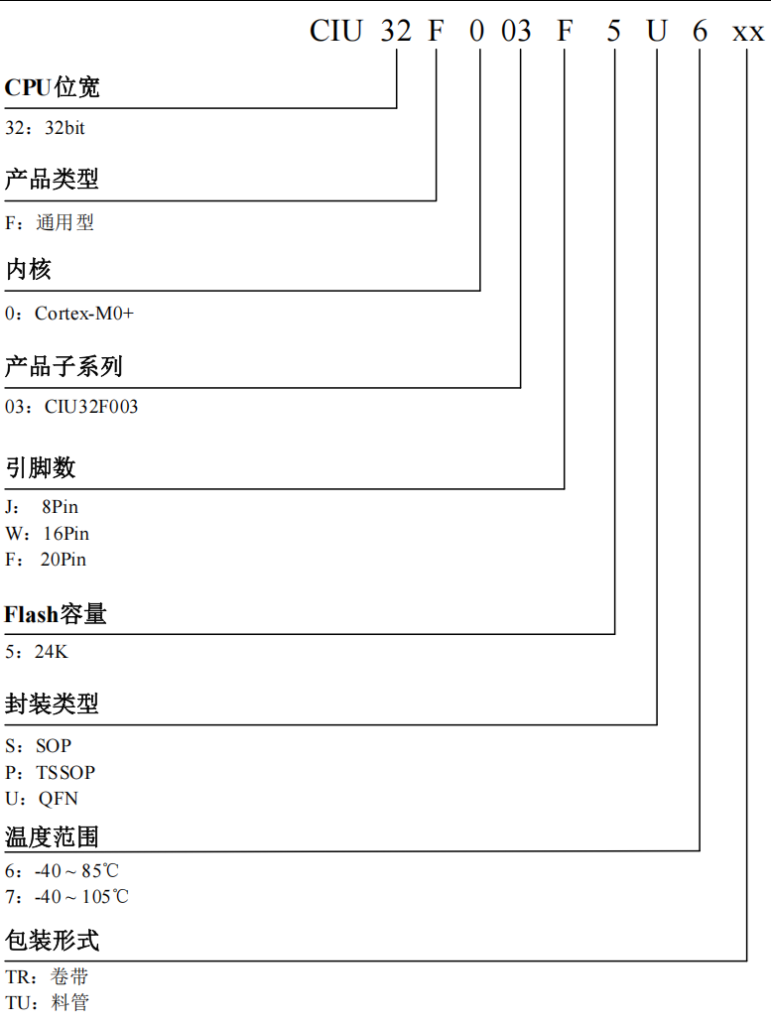 芯片简介:CIU32F003 系列超值安全 MCU 基于 ARM Cortex-M0+内核,最高频率可达48MHz,具有多达 24K bytes Flash、3K bytes SRAM,支持 TSSOP20、QFN20、SOP16、SOP8 等多种封装。内部集成 1Msps ADC、2 个低功耗比较器、最高速率可达 24Mbps 的 SPI、2 个 UART、I2C、多种定时器等丰富的外设资源。