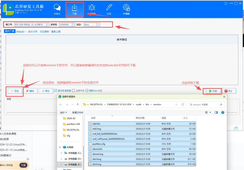 选择下载,选择串口,通道选择A或C,波特率12000000,添加需要下载的文件,开始下载。