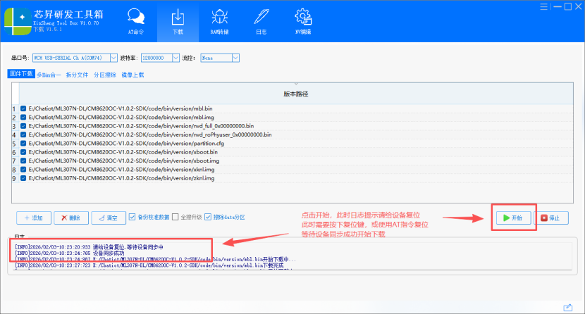 点击开始下载后,需要复位模组以同步设备开始下载
